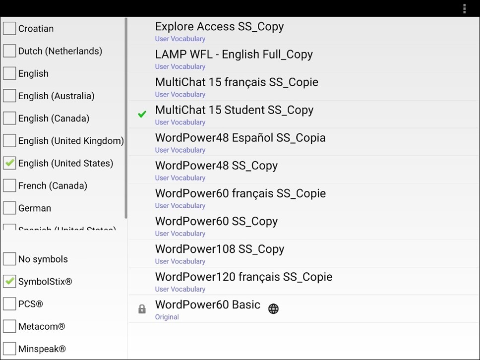 The application provides a variety of vocabulary files. To view these files, go to Menu > Library. Available vocabulary files will be listed.