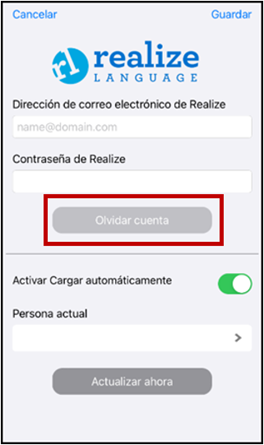Si desea borrar sus credenciales de la cuenta de Realize Language, seleccione Olvidar cuenta en la ventana para ingresar a Realize Language. Por ejemplo: digamos que usted es un clínico y desea desconectar su cuenta de Realize Language antes de prestarle su equipo a un cliente. Al hacer esto, el correo electrónico de su cuenta de Realize Language no estará visible y su cuenta no acumulará los datos recolectados para el cliente.