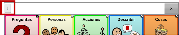 Activa o desactiva el Modo de edición. En Modo de edición, aparecerá un marco alrededor de todos los botones para indicar que los puede editar. Cuando el menú desaparece, aparecerán en color rojo y en la parte inferior de la pantalla las palabras “Modo de edición” seguidas del nombre del archivo de vocabulario y el nombre de la página actual.