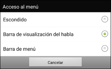 La ubicación predeterminada del botón de menú está en el lado izquierdo de la Barra de visualización del habla (BVH).