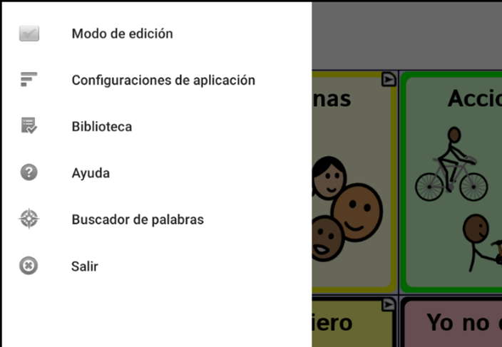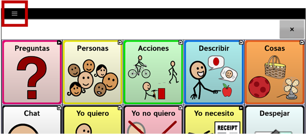 El botón de Menú aparecerá en la Barra de visualización del habla (BVH). Cuando seleccione el botón de Menú, aparecerá el menú en el lado izquierdo de la pantalla. Seleccione una opción para abrir la función.