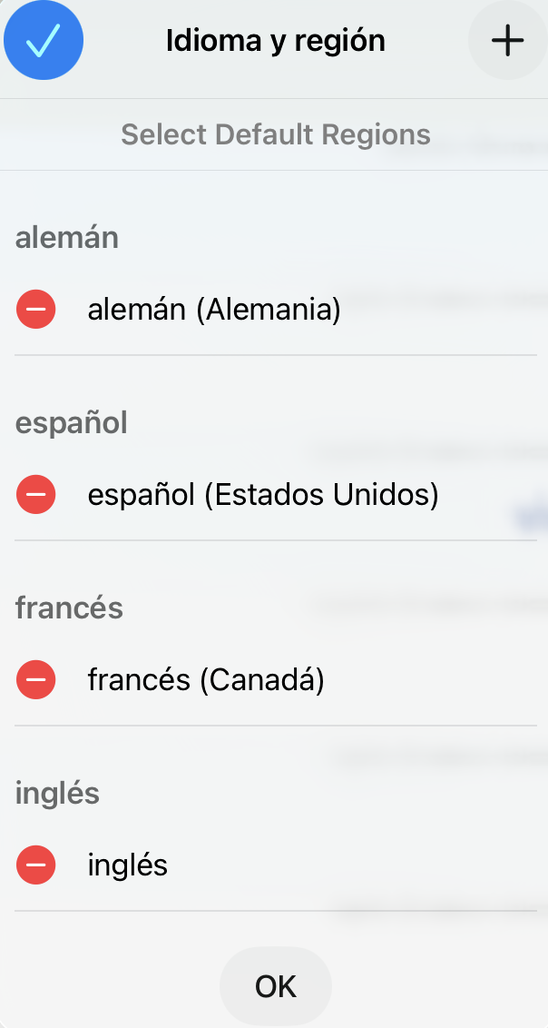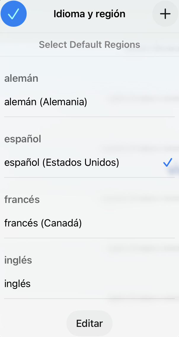 Seleccione el signo + en la parte superior derecha para abrir una lista de todos los idiomas/regiones disponibles.