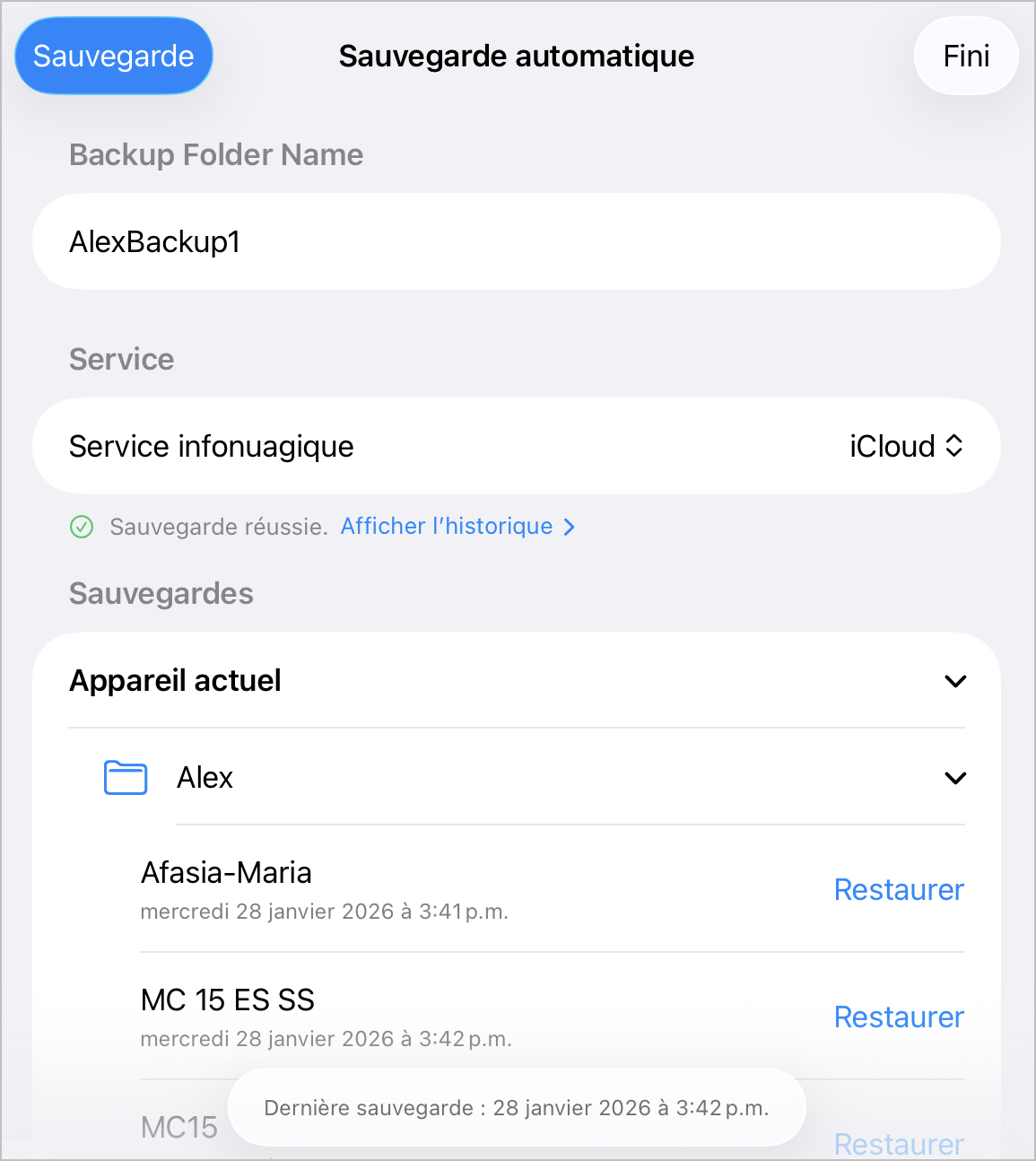Une fois le fichier restauré, une coche remplace l’option « Restaurer » à côté du nom dans le dossier de sauvegarde automatique.