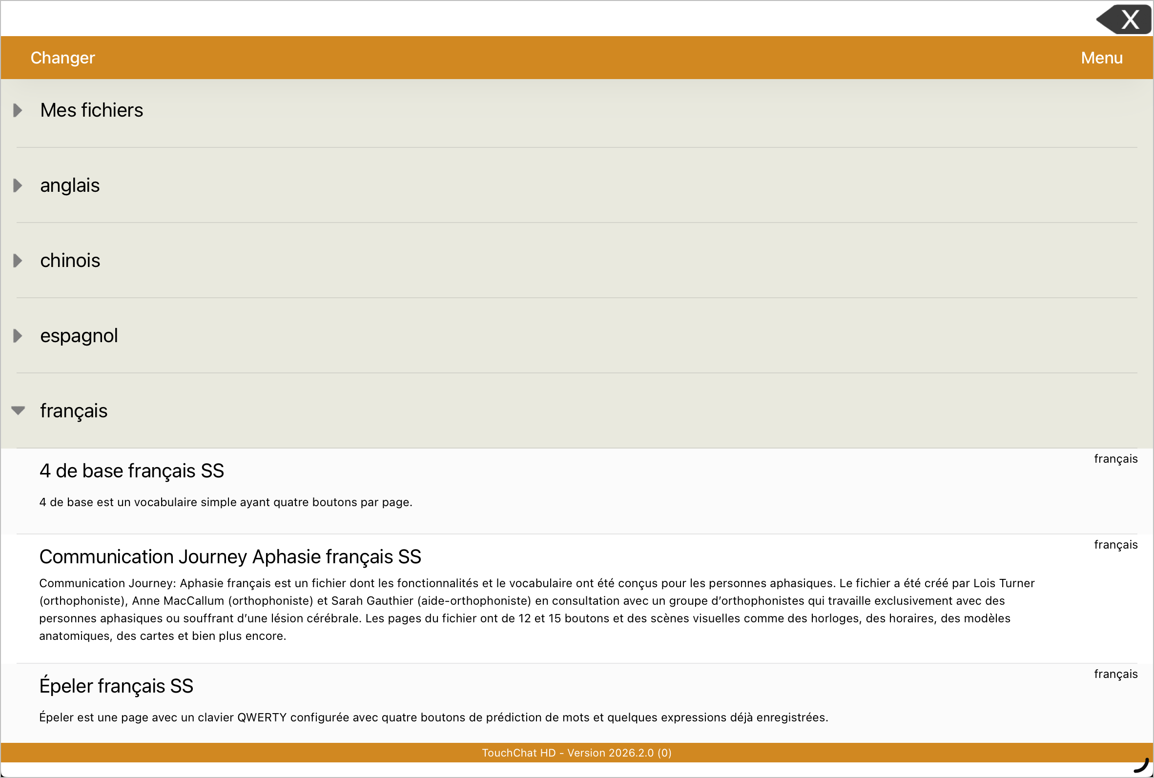 Les fichiers personnalisés se trouvent dans « Mes fichiers ». Tous les autres fichiers sont classés par langue. Pour vous assurer de travailler avec la version la plus récente d’un fichier de vocabulaire, vérifiez la date et l’heure de modification affichées après le nom du vocabulaire. Une coche indique le fichier de vocabulaire précédemment sélectionné.