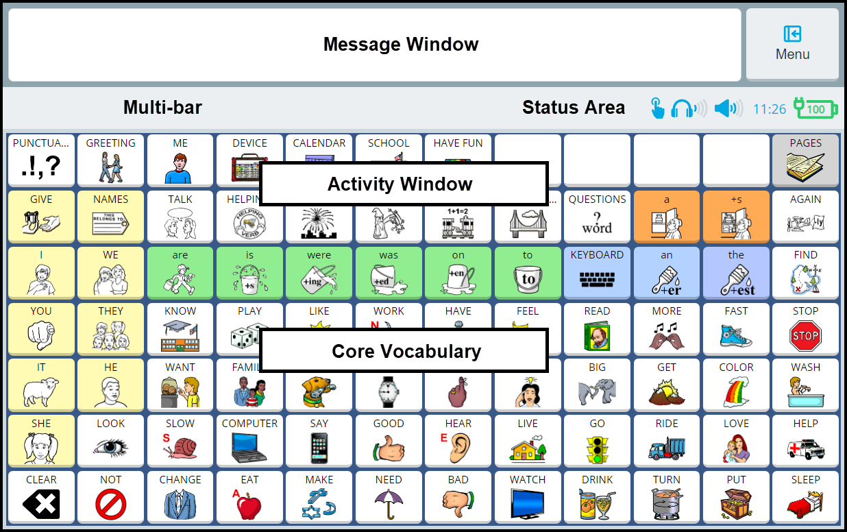 Most frequently used words: These are used regardless of the situation, the person being communicated with, or the age/disability of the communicator. Core vocabulary allows people to convey their message.