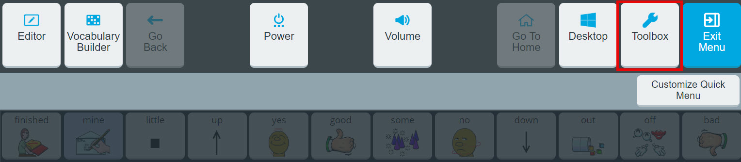 The Toolbox provides access to User Settings, Vocabulary, System Settings, and Applications. To open the Toolbox, select Menu and then Toolbox. The Toolbox will open to the User Settings tab.