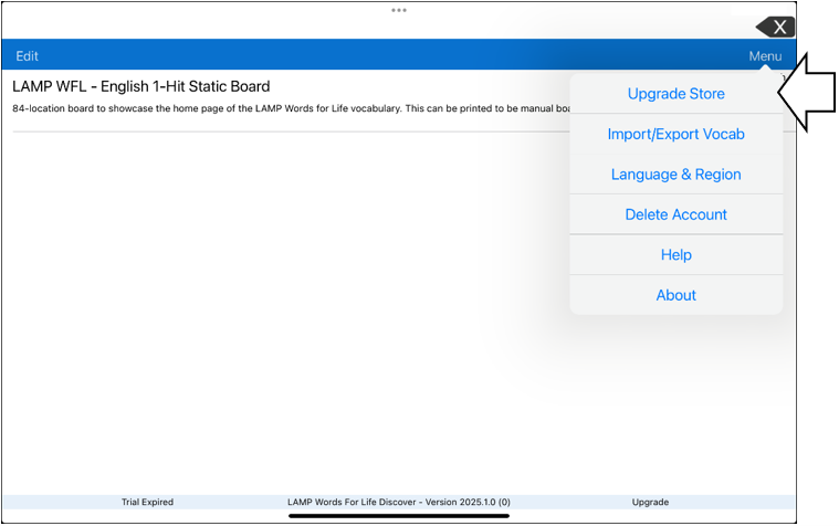 Select Upgrade Store. The Trial/Upgrade screen will reopen and allow you to purchase the upgrade.
