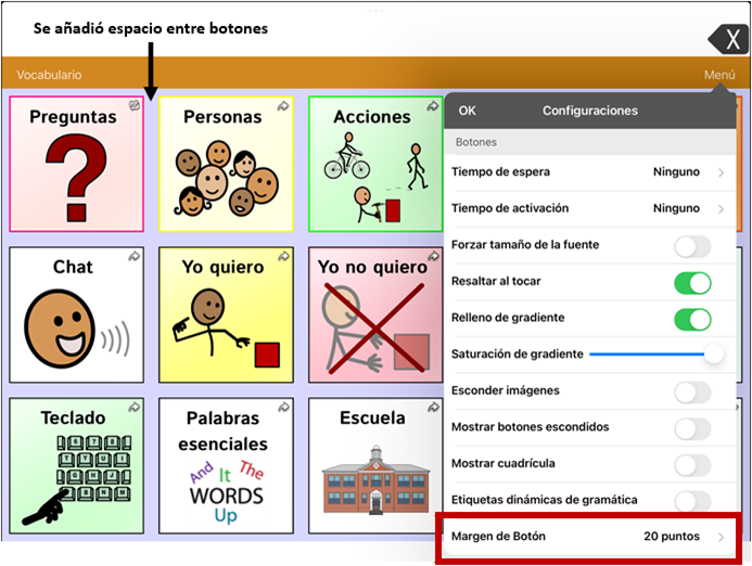 5. Al realizar una selección, cambiará el espacio entre los botones.